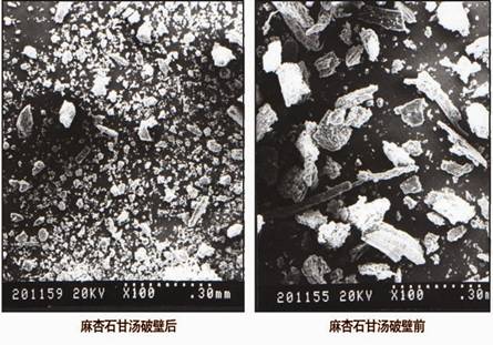 分析證明:中藥材粉至300目,綜合細胞尺度破壁率可達到86.5%以上。實踐中對300目的微粉用電子顯微鏡觀察,已經(jīng)很難看到完整的細胞。看到的只是細胞碎片。例如:復方粗粉鏡檢時能看到藥物組織結(jié)構,—300目98%微粉已完全看不出藥物組織結(jié)構,只能看到細胞碎片。見圖1:《復方藥粉一般粉碎照片與—300目微粉電鏡照片對比》