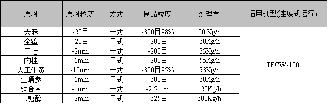 某藥廠生產(chǎn)的名牌中藥原采用的工藝是:配料→柴田粉碎機粉碎→V型混煉機混煉→出料,F(xiàn)采用天方微粉機后的工藝是:配料→天方微粉粉碎混煉45秒鐘→出料。完全克服了原工藝粒度粗、有白點的缺陷,提高、穩(wěn)定了藥品質(zhì)量,同時提高效率。