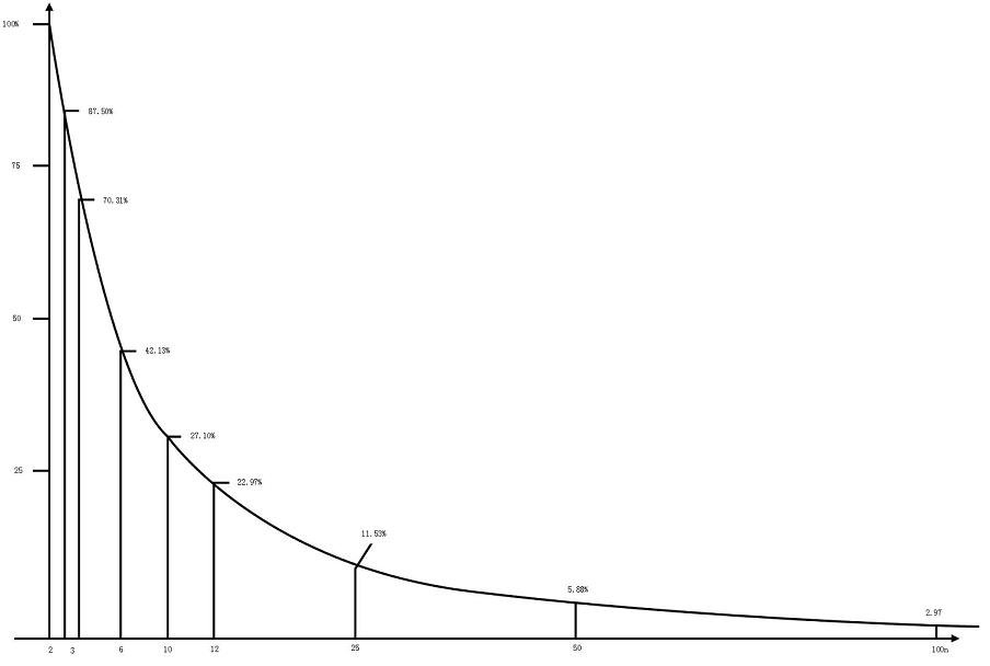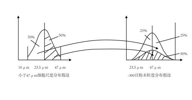 2、為討論分析方便,視小于47μ的細胞尺寸分布以47μ為上限,10μ為下限,中心為23.5μm的對稱分布,視-300目粉末為中心為23.5μ的對稱正態(tài)分布(以這個假設為基礎分析要比以實測圖5的威布爾分布分析嚴格得多)。
